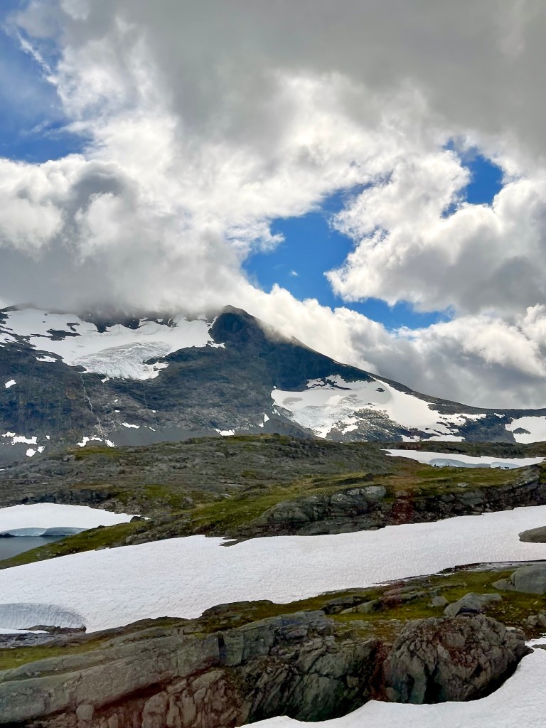 We had chosen to participate in a bus tour called “scenic Skjolden” without having the faintest idea what the tour entailed. It turned out to be a trip way up into these immense mountains that surround the village, motoring between glaciers, icy lakes, and a weird rock monument.