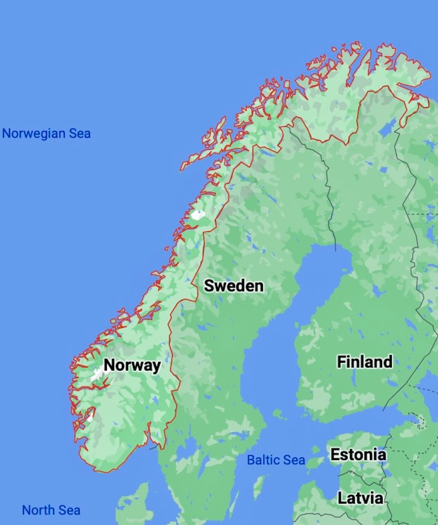 Here you see the entirety of skinny Norway, snuggling alongside Sweden, Finland, and Russia on her land boarders, while the Skagerrak to the South, the North Sea, the Norwegian Sea, and the arctic Barents Sea in the North frame Norway’s coastline. Norway is a country of contrasts, one might even say a country of extremes. Sørlandet, the southern fertile valleys contrast against the barren tundra of the far North, while the mountain ranges form a backbone supporting her near endless coastline.