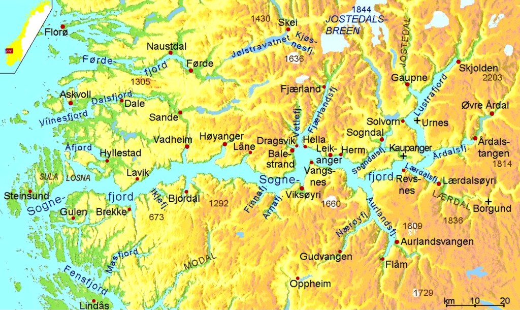 It took us thirteen hours to sail from Bergen (lower left) to Skjolden (upper right), first navigating for 72 Km or 45 miles between a multitude of coastal islands and innumerable skerries, before entering Sognefjorden. With an overall length of 205 Km/127 mi, this is the longest fjord in Norway and the second longest in the world, only surpassed by Kangertittivag aka Scoresby Sound in East Greenland. There we go, second again! As far as fjordal water depth is concerned, Norway has to accept third place, though, with a miserly 1308 m/4291 ft below sea level, behind number one, the Antarctic Skelton Inlet with a depth of nearly 2000 meters, followed by Chile’s Messier Channel with almost 1400 meters. Sognefjorden is so long, it can even be seen on my first map above showing all of Norway. It’s the red, squiggly line beginning at the Western coast and stretching nearly halfway across the country toward Sweden. The last upward hook is Lustrafjorden with our village of Skjolden right under the “N” for Norway.
