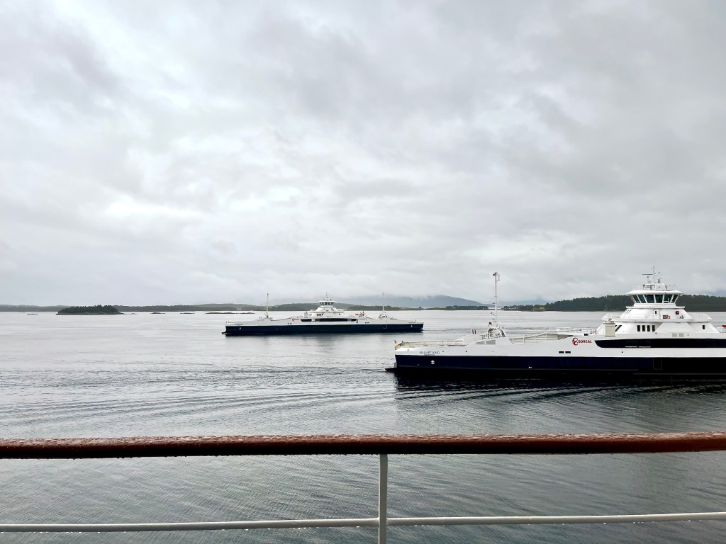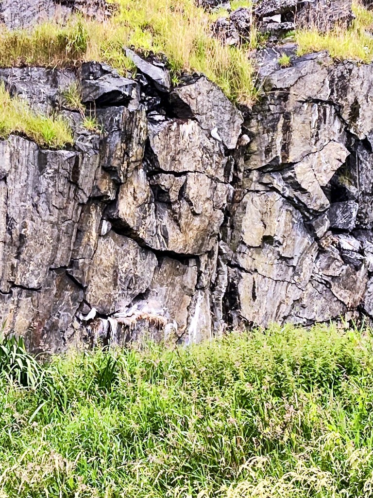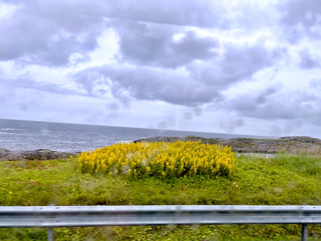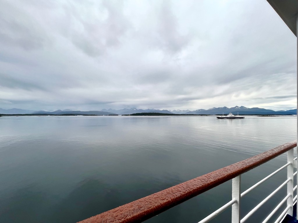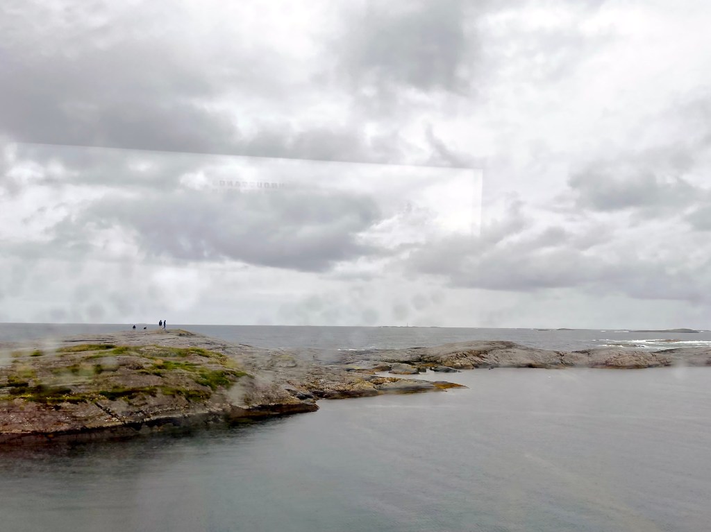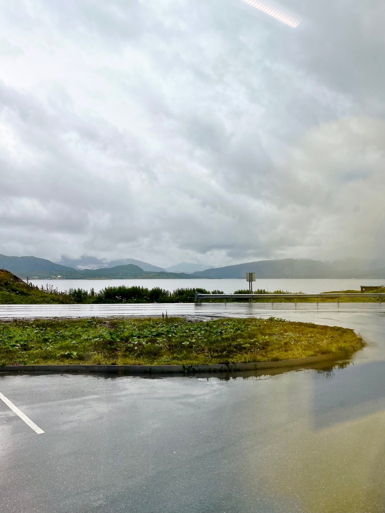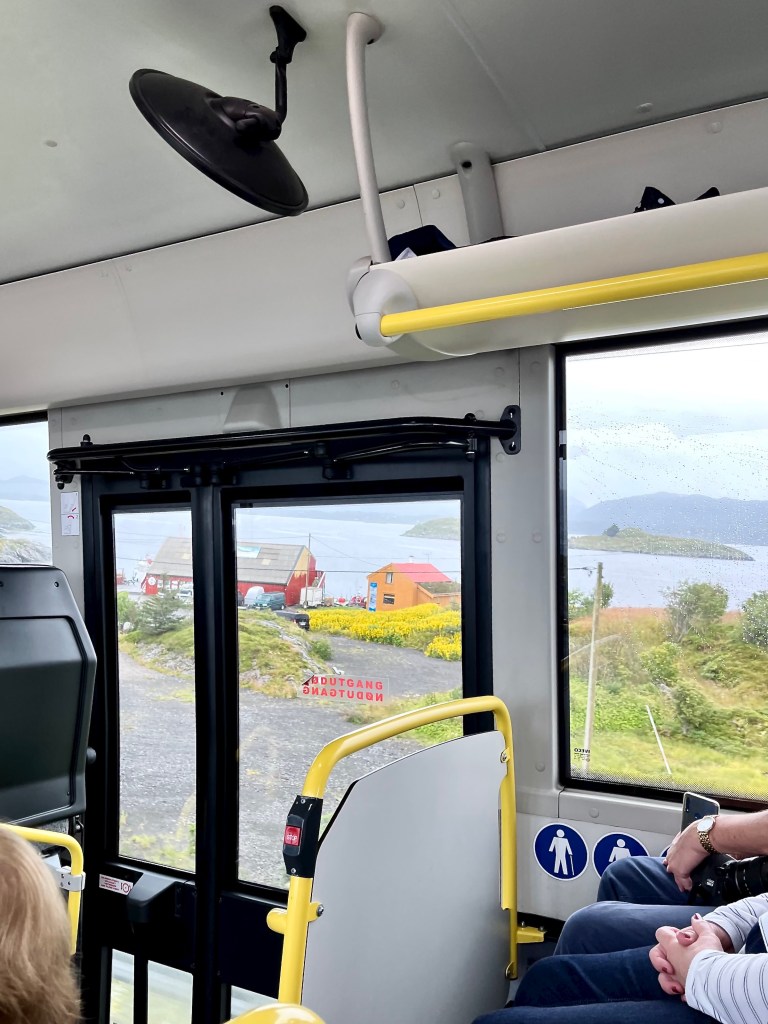 Finally, we reached another rest stop, this one with toilets and a, shall we say, mini-cafΓ© about to close. The heavy rain had apparently flooded two of the four toilets and made them unusable. Hence the line was long and waiting my turn took up nearly the entire 20 minutes break time allotted. My loving husband had meanwhile secured a cappuccino to go for me, thanks! This stop on tiny EldhusΓΈya (island) had a secure, circular walkway around a large granite outcropping that crocodile stick and I could’ve handled, but the paucity of time made it impossible. There we were in a unique place we’re unlikely to ever visit again and the tour guide planed so poorly that we couldn’t actually see anything. Very frustrating indeed.