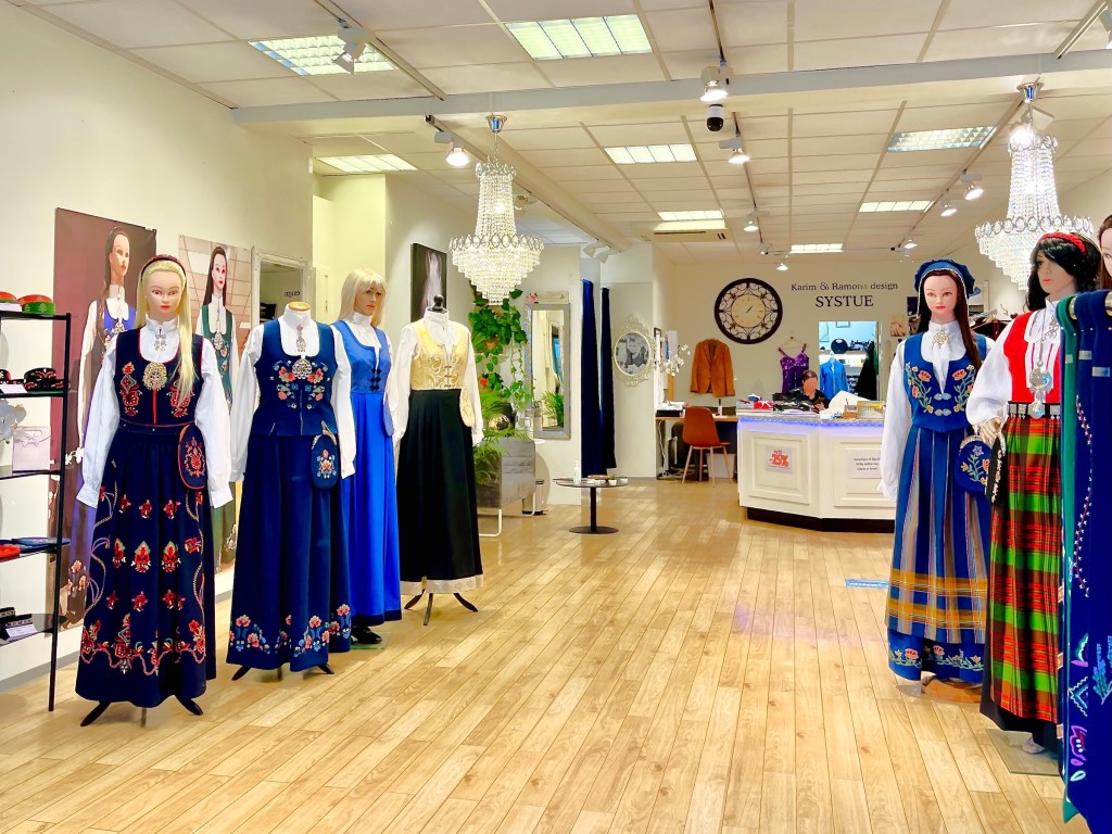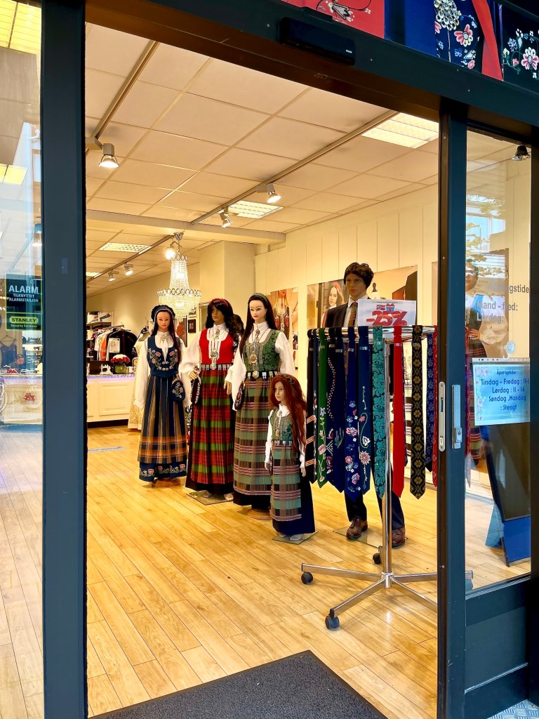 We passed by a custom tailor shop for the Norwegian traditional dress called Bunad. They are an expression of Norwegian national pride and their design is based on rural folk costumes know since the 14th century. Bunadar (plural) came into use during the rise of the National Romanticism movement in the mid-19th century as a reaction to hundreds of years of Swedish and Danish dominance over Norway. Many women, and lately increasingly also men, wear their regional versions of Bunadar for special occasions, in particular for Constitution Day on May 17, but also for other big celebrations. For example, It has become fashionable for grandparents to have a Bunad made for their granddaughter’s Confirmation, as did the royal couple for their granddaughter Princess Ingrid a couple of years ago. The garments are custom made from the best wool cloth and are embroidered and appliquΓ© by hand. Matching accessories are a must, like stockings, shoes, shawls, and headgear, which is different for married and unmarried women. There is also specific silver jewellery that is traditionally used with Bunadar. Silver has long been considered a charm against evil in Norway, for example babies had a silver brooch pined to their swaddling to prevent trolls from switching them with a baby troll. The most elaborately decorated bunadar can take a year to make and such an outfit is considered a once in a lifetime purchase, not least because of the cost!