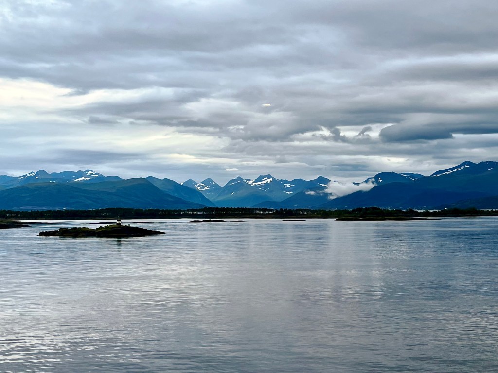 These Nordic Alps consist of a chain of >200 mountain peaks guarding Romsdalfjorden. There are permanent snowcaps, ice fields, and glaciers to be admired year round. Sadly, we only got brief glimpses now and then.