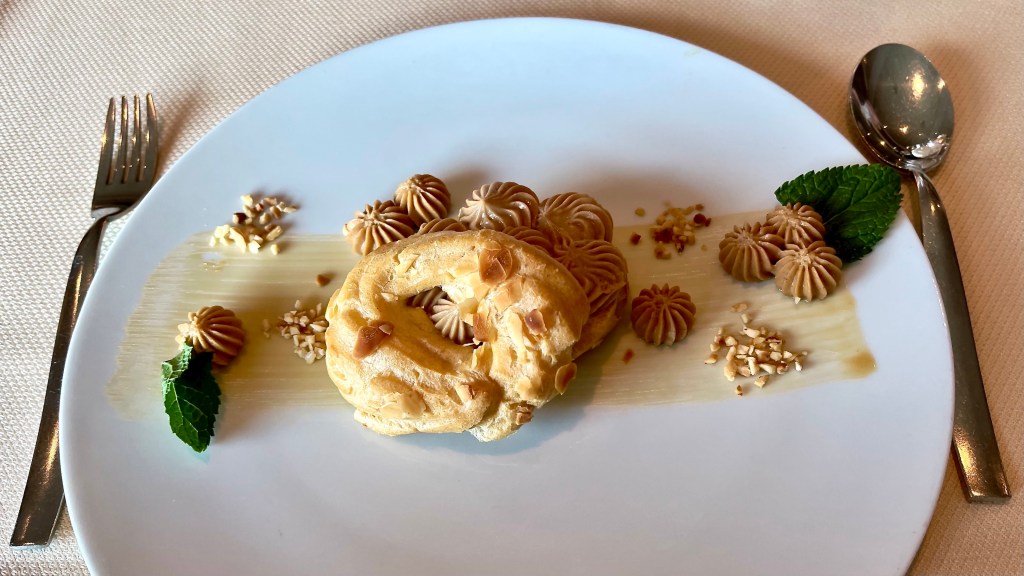 For dessert that evening, I decided on a pastry that I have enjoyed here in France many time, a “Paris-Brest”. The pastry was first created in 1910 to commemorate the 20th anniversary of the annual bicycle road race Paris-Brest-Paris. It’s made of pΓ’te Γ choux in the shape of a wheel, naturally, filled with yummy crΓ¨me mousseline pralinΓ©e. In France all pastries have a standardised name that everyone knows, of course, having grown up with it. This can be a bit difficult for strangers, who have to read the name tags, if available, or just point like imbeciles.
