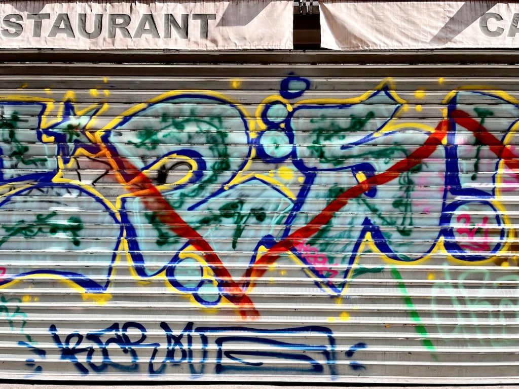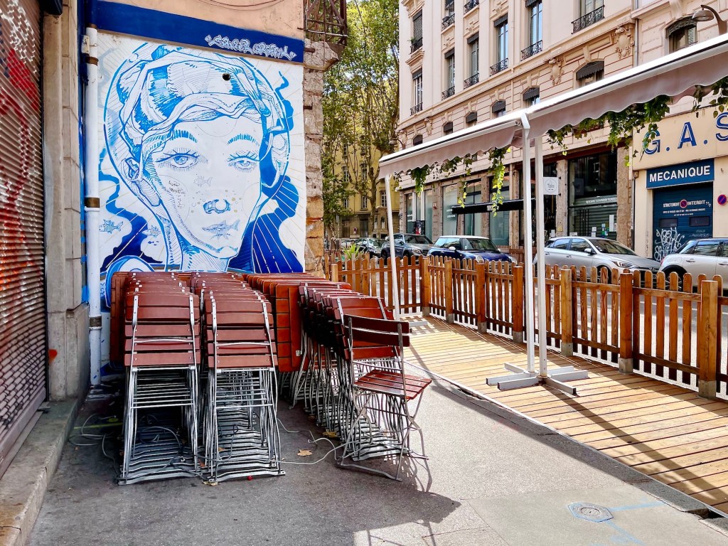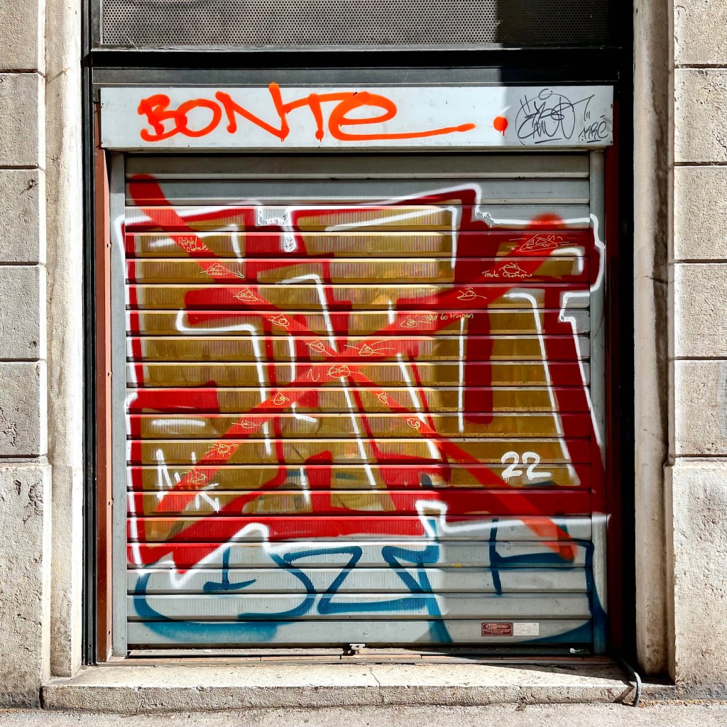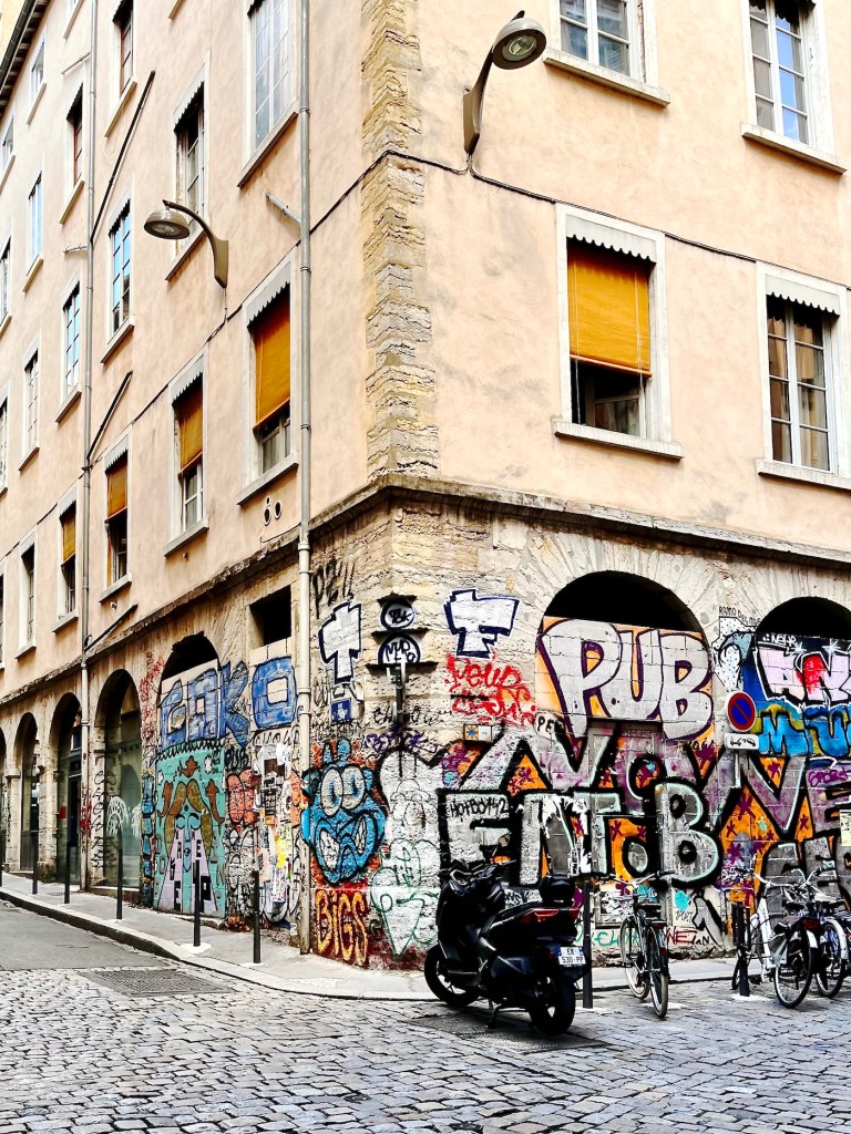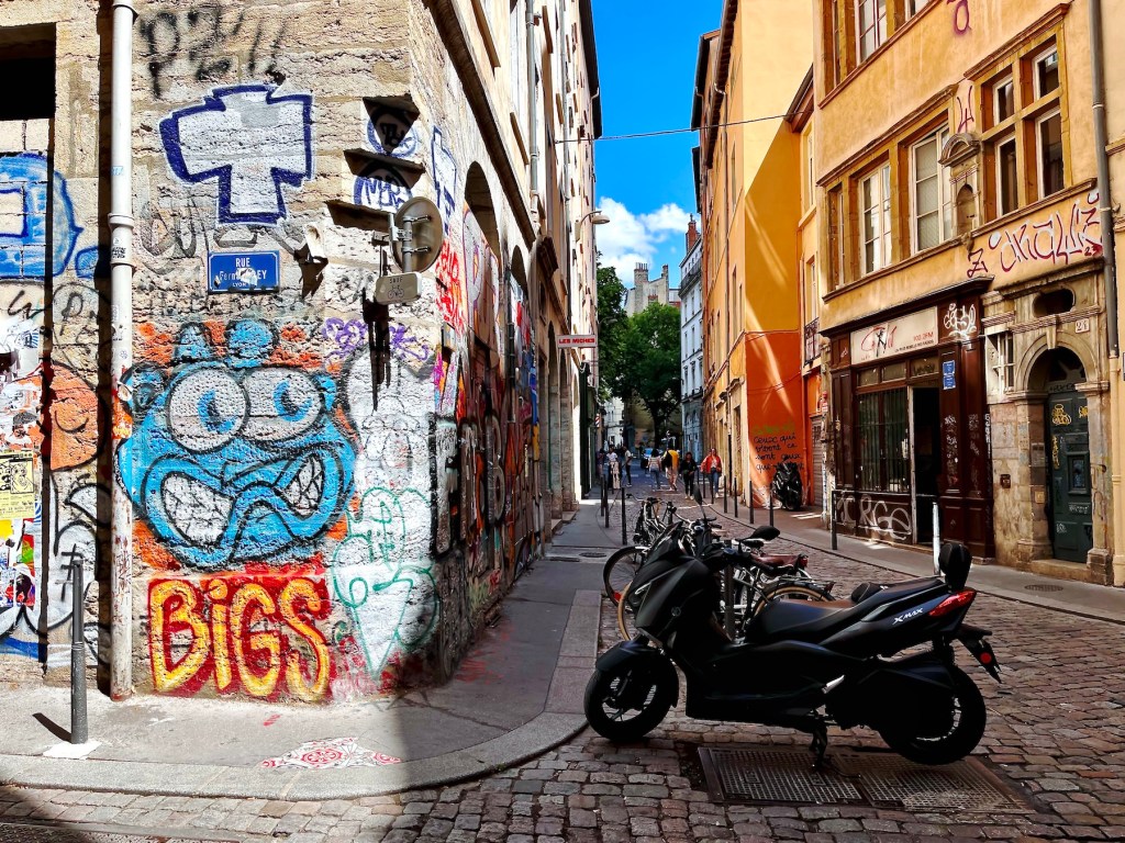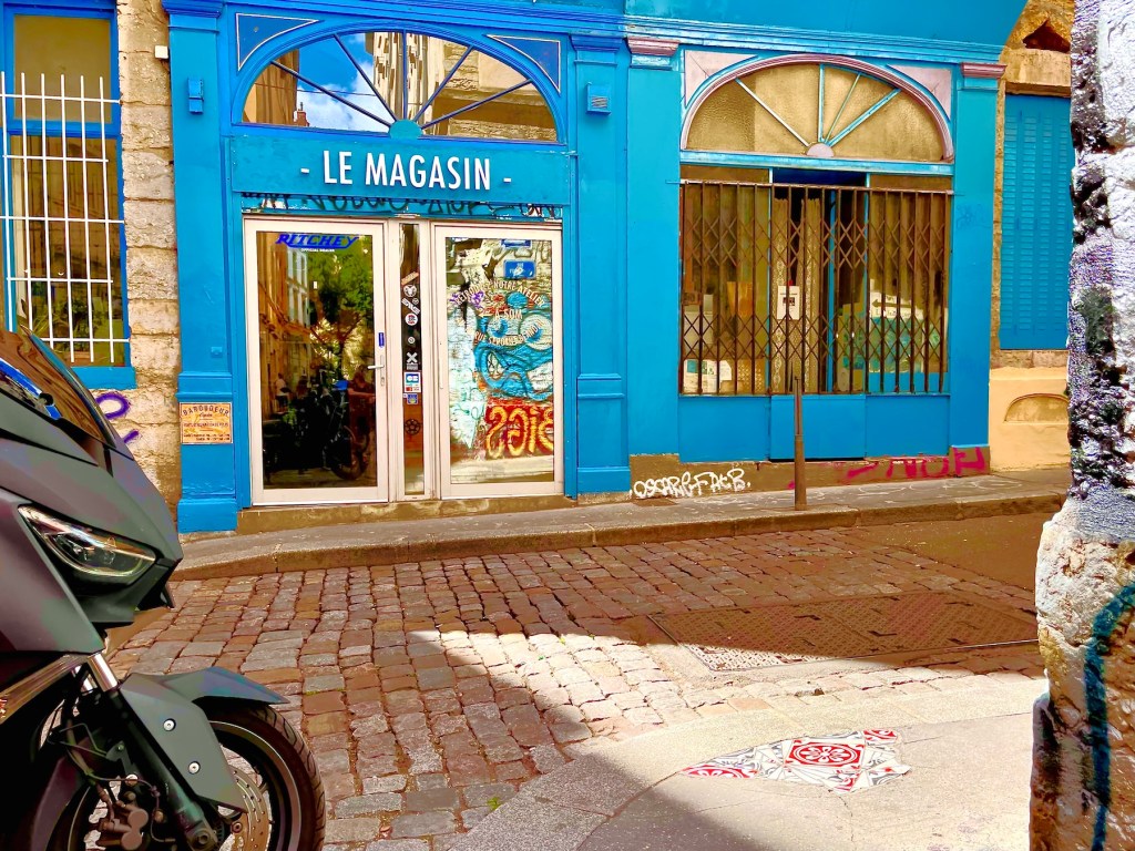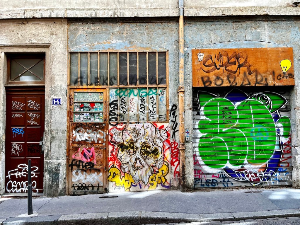 The “Canut” radio station, styling itself as the biggest rebel of radio, drove me to distraction earlier in the morning. Some annoying humming, reminiscent of Tuvan overtone throat singing was wafting through our apartment from an undetectable source. The Tuva are a nomadic people of the High Altai, and like many other indigenous peoples, they produce a kind of humming-singing deep in their throats that reverberates in unique ways. In the video link, the most typical portion of traditional throat singing runs from second 0.35 to 1.10. The rest is a more contemporary interpretation. I learned about Tuvan traditions through the books of Galsan Tschinag, a Tuvan Elder, Shaman, and poet, who, amazingly, writes in German. When I lingered at the intersection to shoot the graffiti pictures above, I heard that humming again and I traced it easily to the radio station. It seemed that our building and the station’s, which are in streets nearly parallel to each other, might share connected courtyards. A demonstration of the secret Lyonnais traboules? A canut, btw, is the traditional Lyonnais nickname for a silk worker.