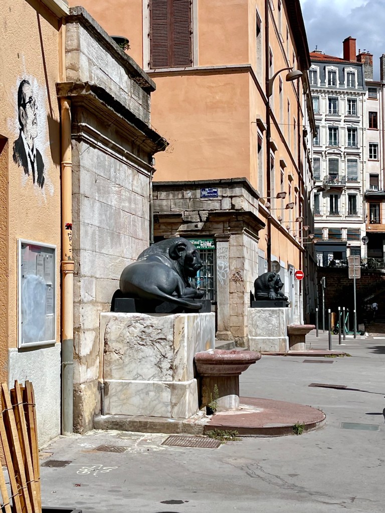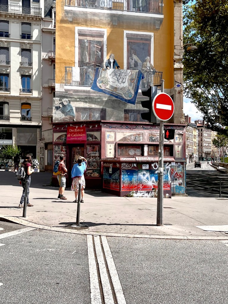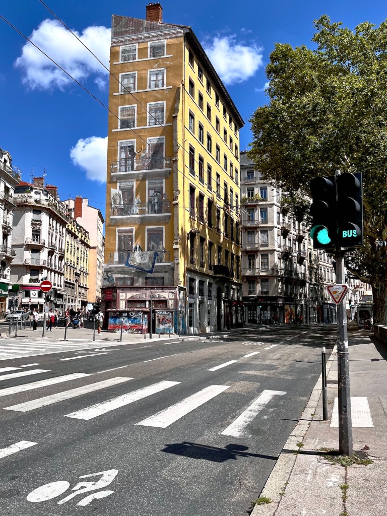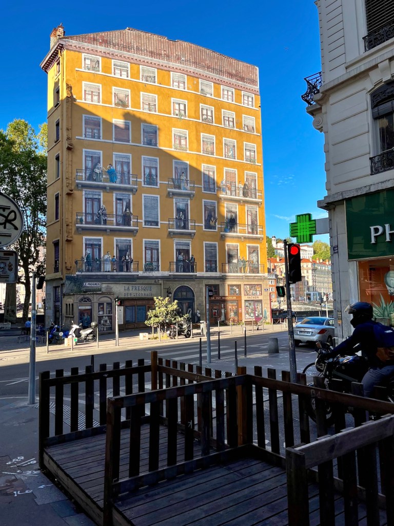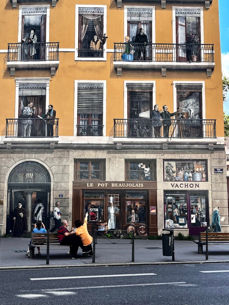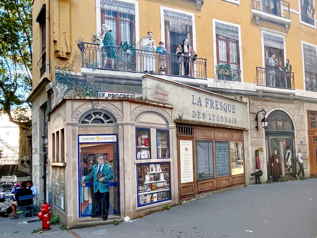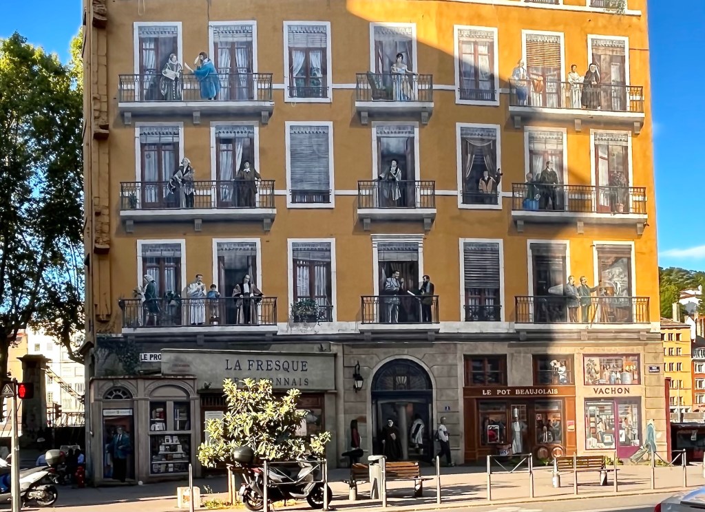 And speaking of buildings, one of Lyon’s best known tourist attractions was just down the block from us, La Fresque de Lyonnais. Twenty-odd years ago the city decided to follow Barcelona’s example and have a building decorated with a full-size trompe-l’œil mural showcasing local celebrities.