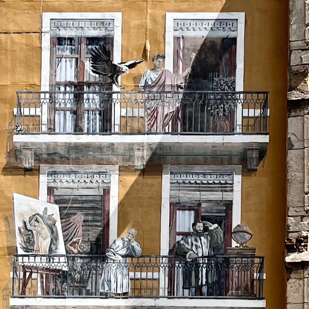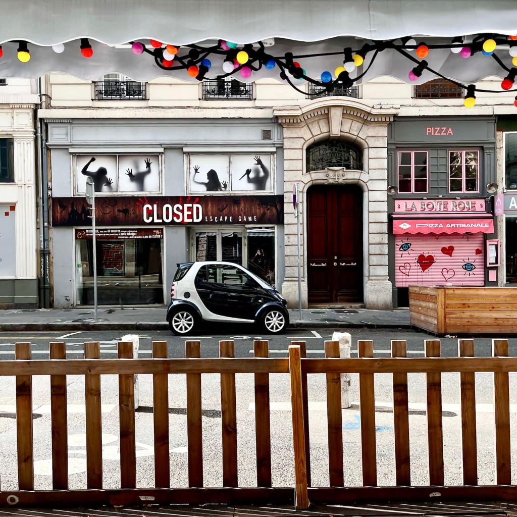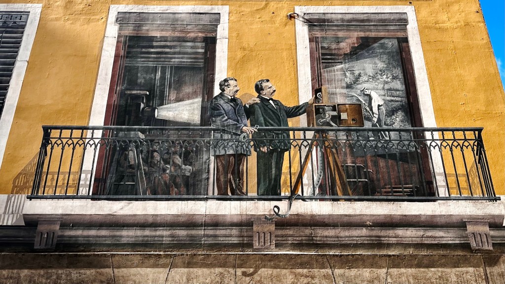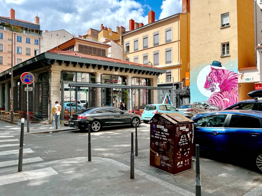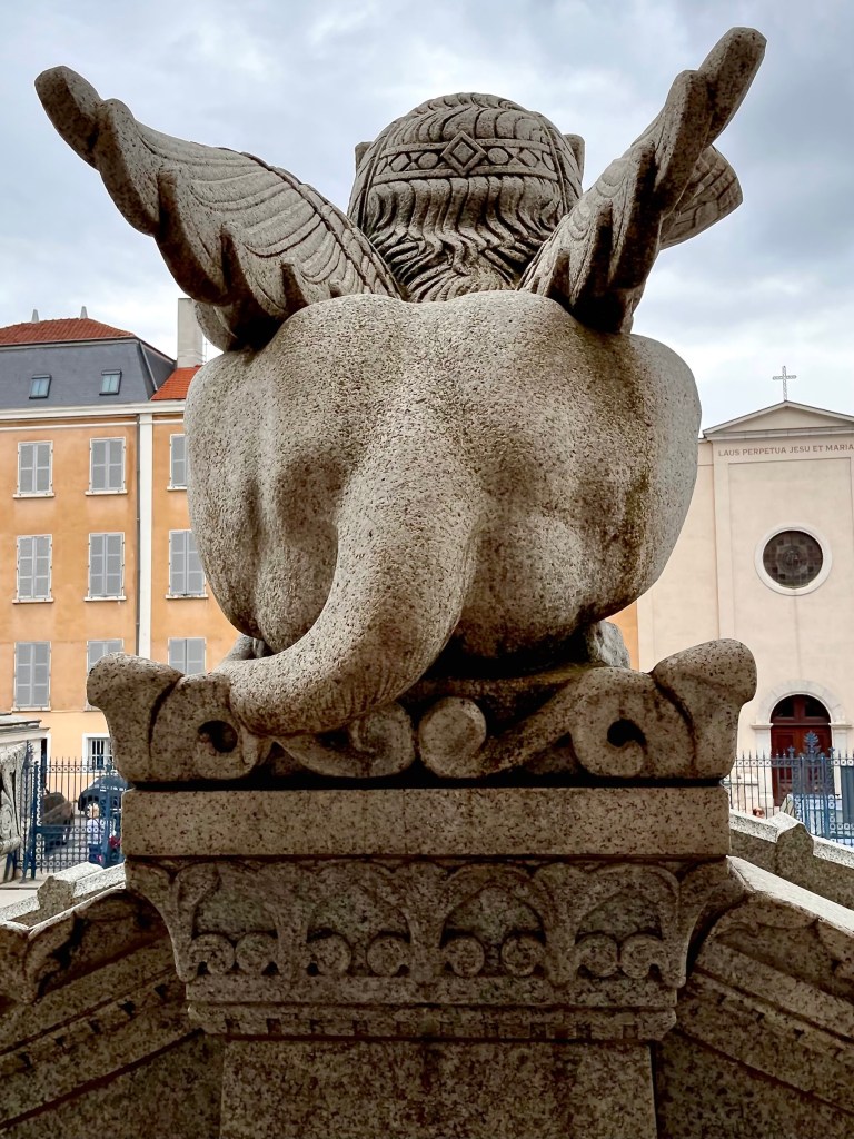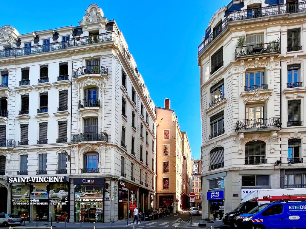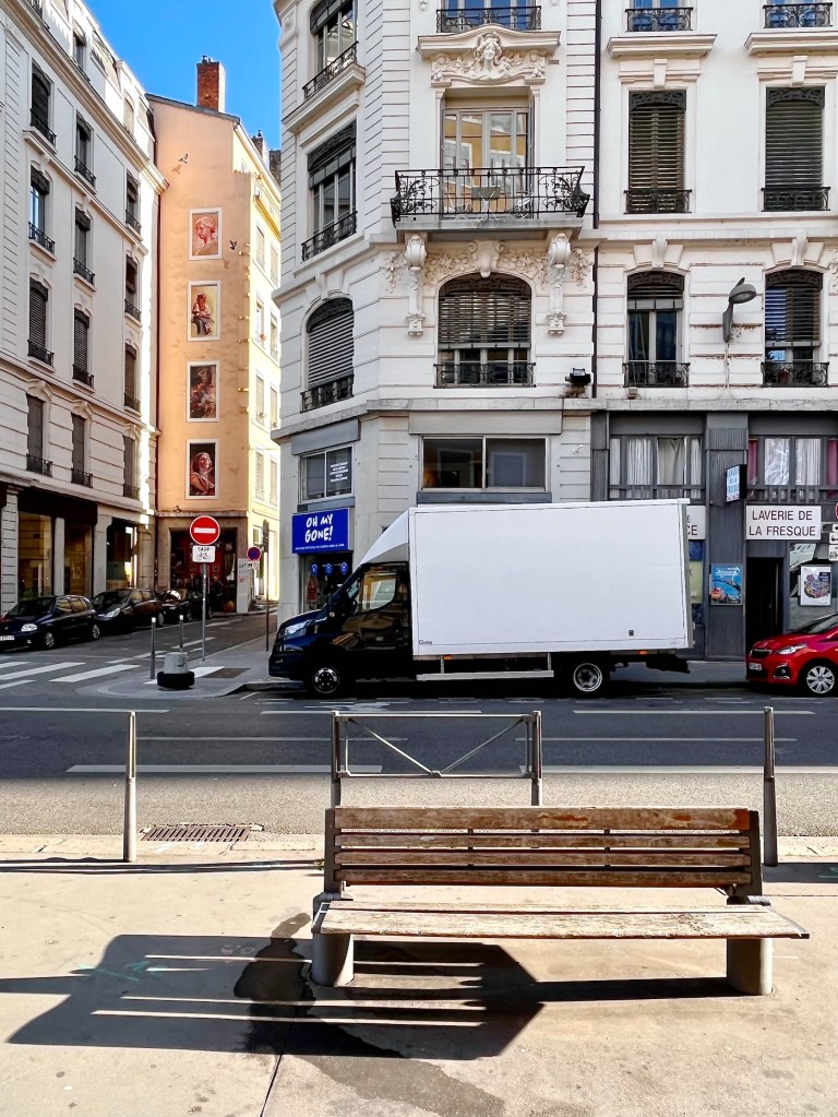 And speaking of buildings, one of Lyon’s best known tourist attractions was just down the block from us, La Fresque de Lyonnais. Twenty-odd years ago the city decided to follow Barcelona’s example and have a building decorated with a full-size trompe-l’œil mural showcasing local celebrities.