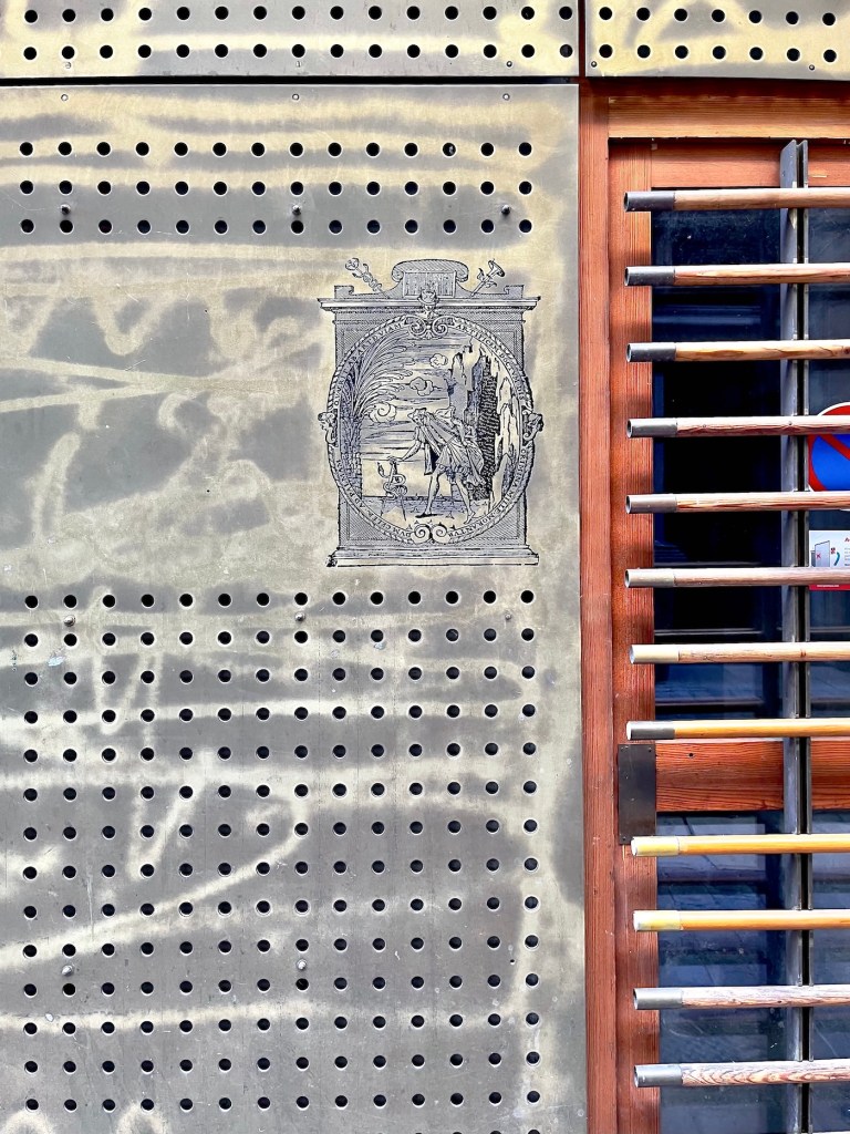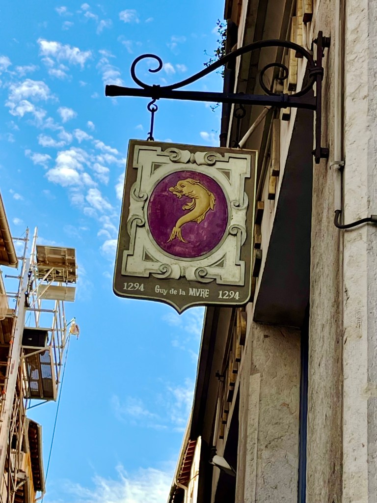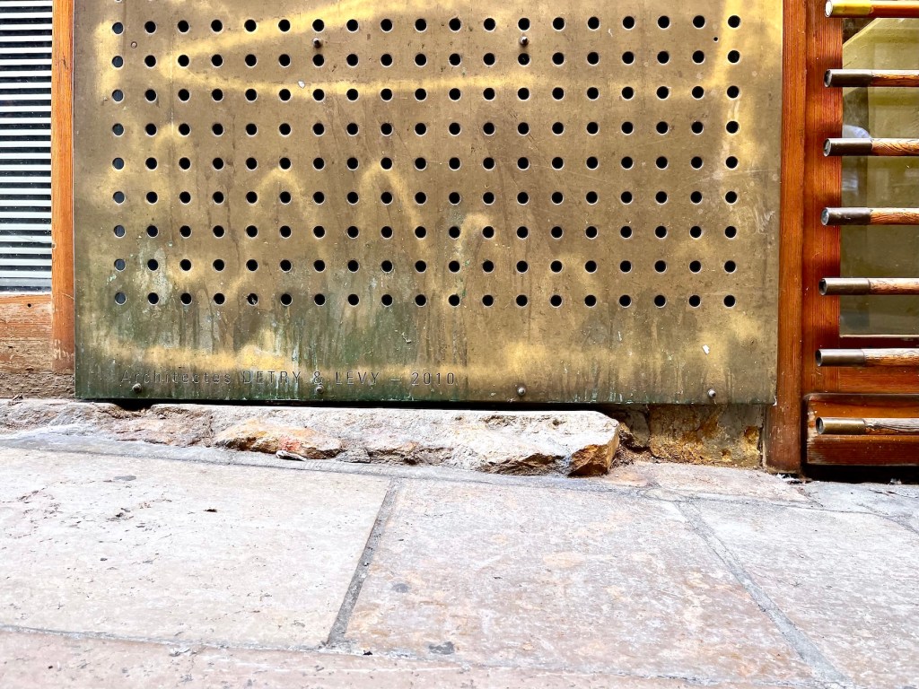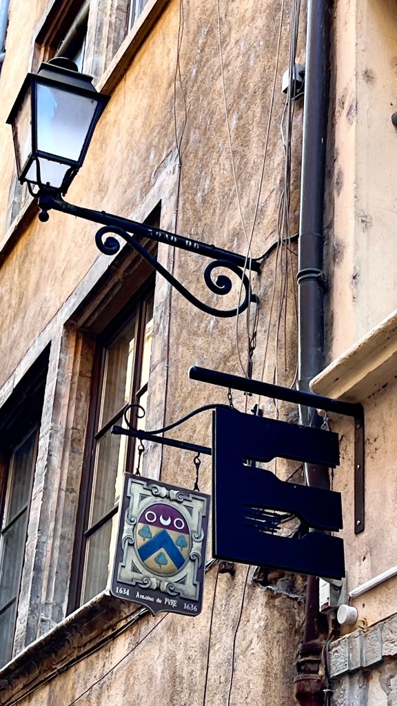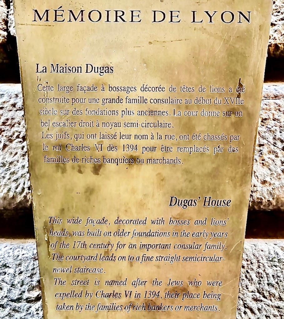 Continuing into the lane, a number of coats of arms mounted high on the walls stood out to me. A French Geneawiki page, titled: “The provosts of the merchants of Lyon” shows the names and the coats of arms of provosts and aldermen. It also explains the historical development of the Lyonnais city council from the 13th through the 18th centuries. The coats of arms I saw in Rue Juiverie were produced with the assistance of the City of Lyon and Crédit Foncier de France, CFF, a major bank, mostly making loans to communities. Wikisource gives this wildly fascinating explanation: CRÉDIT FONCIER, landed credit, the French name for a method of borrowing money on the security of landed property which is widely practiced in France and other Continental countries. … and so forth … 😴😴😉