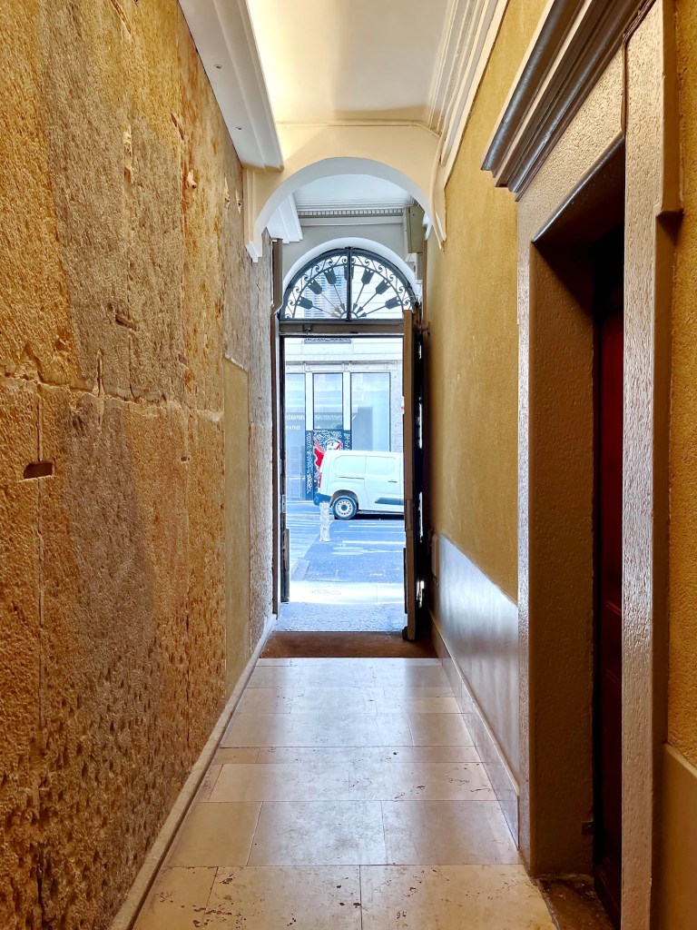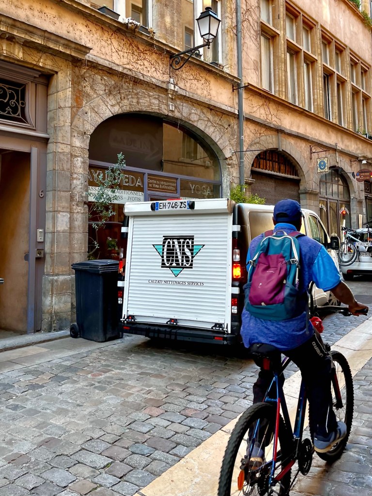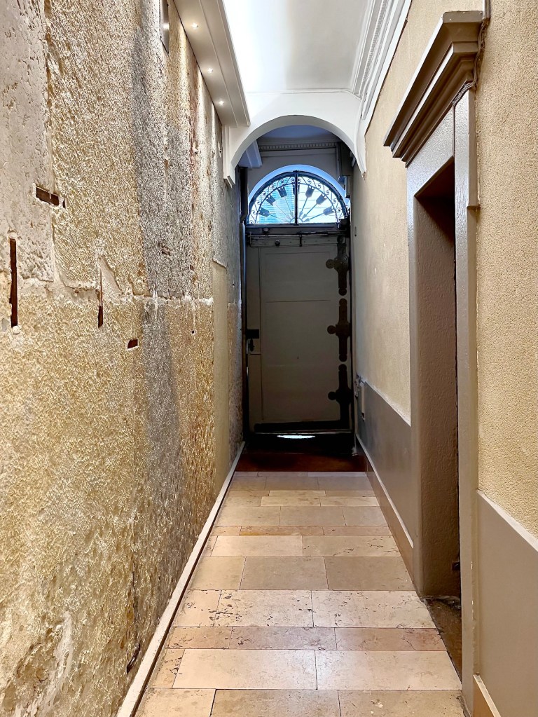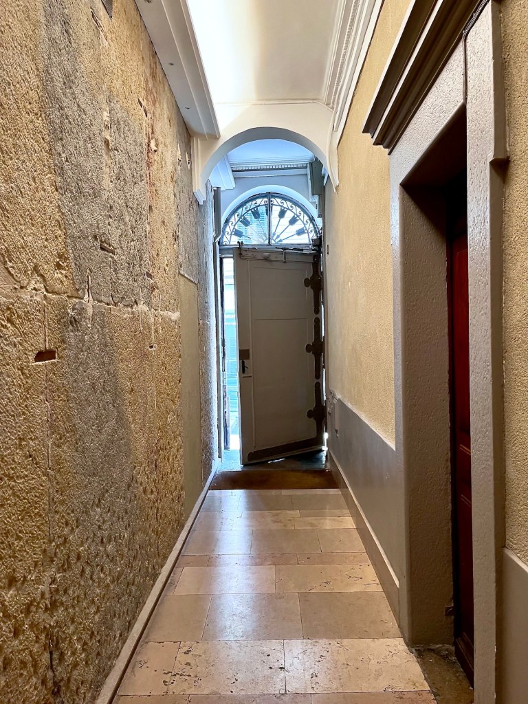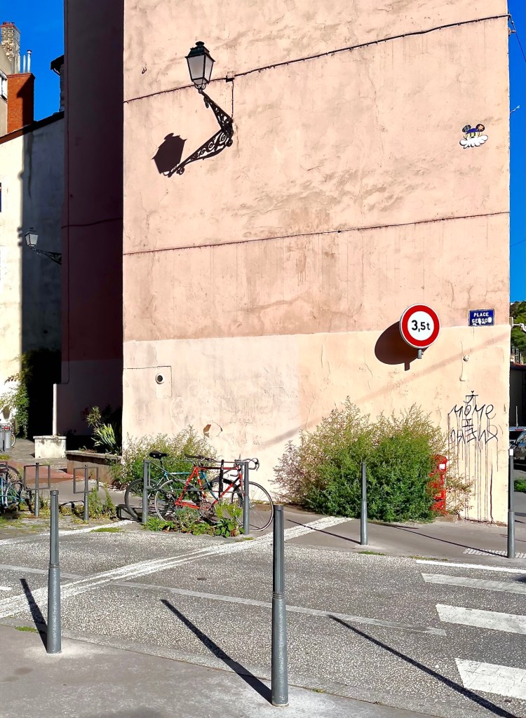 Continuing into the lane, a number of coats of arms mounted high on the walls stood out to me. A French Geneawiki page, titled: “The provosts of the merchants of Lyon” shows the names and the coats of arms of provosts and aldermen. It also explains the historical development of the Lyonnais city council from the 13th through the 18th centuries. The coats of arms I saw in Rue Juiverie were produced with the assistance of the City of Lyon and Crédit Foncier de France, CFF, a major bank, mostly making loans to communities. Wikisource gives this wildly fascinating explanation: CRÉDIT FONCIER, landed credit, the French name for a method of borrowing money on the security of landed property which is widely practiced in France and other Continental countries. … and so forth … 😴😴😉