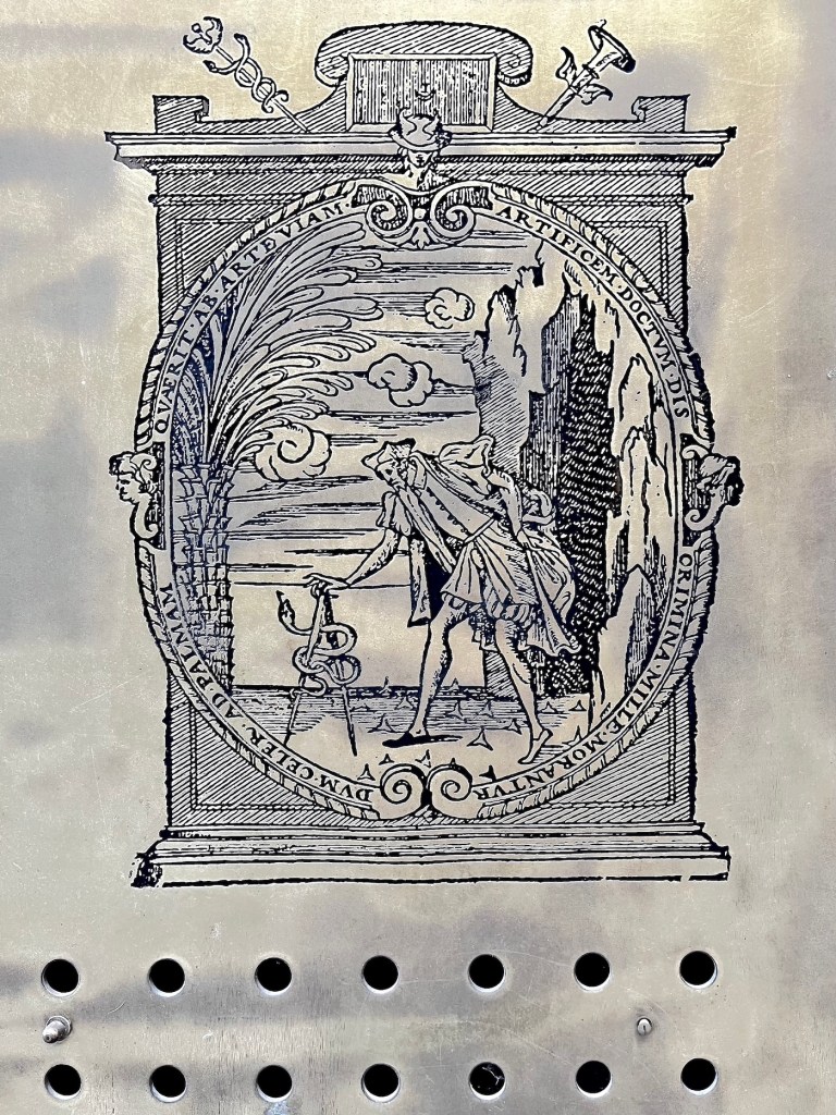 A little further along, I gasped in surprise at the sight of a splendid modernist gateway, anchored within the original Renaissance framework by an iron brace. It’s sad to see the the neglect, though. The architects Detry & Levy of Lyon created it in 2010.