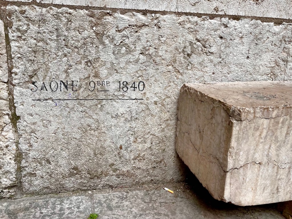 Next to the stone bench in front of the church, behind the streetlight, I found a marker commemorating the great flood of November 1840. It was caused by periods of torrential rains throughout the fall, that were reinforced in late October by several heavy storms downstream, when finally the whole shebang was whipped into a frenzy by very strong southerly winds. This Saône flood is still used as the reference flood to develop risk prevention plans. I wonder, if our current trend toward ever greater weather extremes might soon make this statistic obsolete.