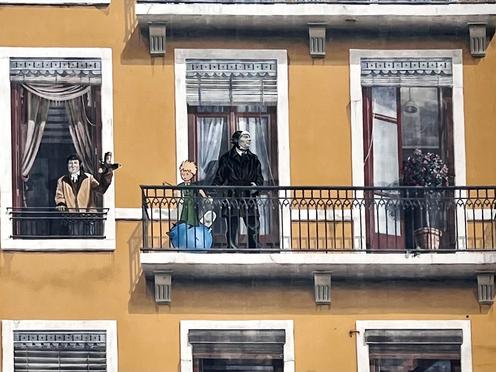 Across the street from the children’s art studio, I found the stage for one of Lyon’s hallmark artistic expressions, the puppet Guignol, the creation of Laurent Mourguet, 1795-1844, a canut, a worker in the Lyonnais silk factories. He lost his job during the French Revolution and became a dentist instead 😉. Read all about the original Lyonnais Théâtre Guignol in this link . A further wiki article adds some interesting info. Currently, the theatre is closed for renovations, so, I have to show you monsieur Mourguet’s balcony scene instead.