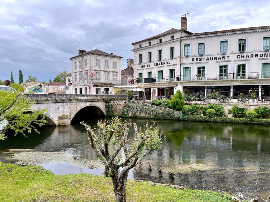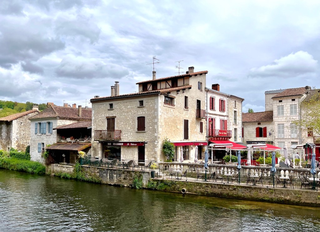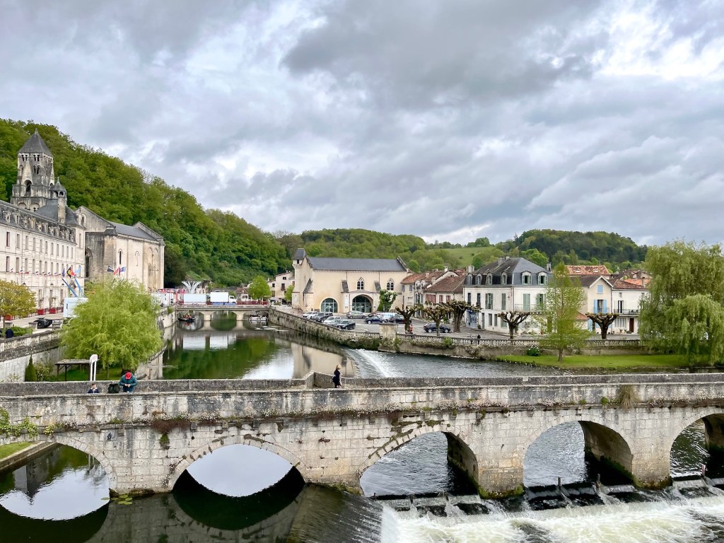 From our terrace, we overlooked the Abbey with church and clock tower (left) and vieille ville, the Old Town section of the village (right), which spreads over an island in the river Dronne. The two arms of the river reconnected right in front of the hotel in a series of weirs. After a short rest, we left the hotel to explore and find some lunch.