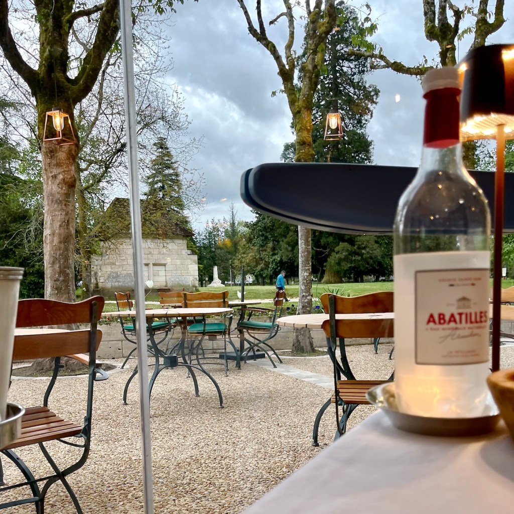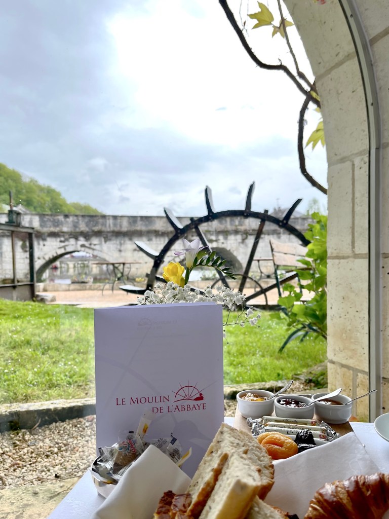 For my birthday dinner downstairs at the Moulin de L’Abbaye restaurant, we were escorted to a window table, beautifully set with starched linens, overlooking the park with its ancient tree.