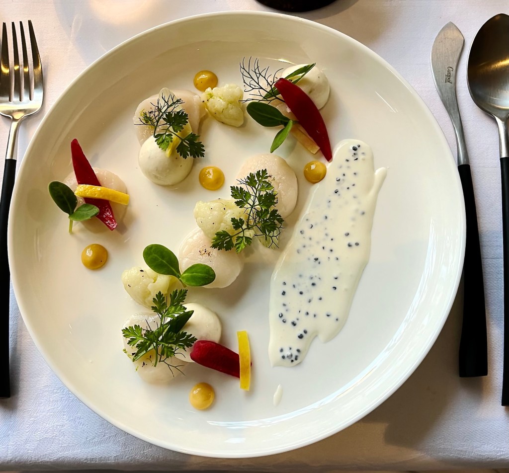 The four-course dinner we had chosen opened with three tiny tidbits to awaken our tastebuds for the coming feast. Three biscuits were topped with a small dollop each of either foie gras cream, avocado cream, or carrot cream with roasted sesame seeds. The colourful canapés were floating on a layer of dried white beans in a triangular, white dish. Very stylish! Unfortunately, I didn’t remember to take a picture until, well, until it was too late.