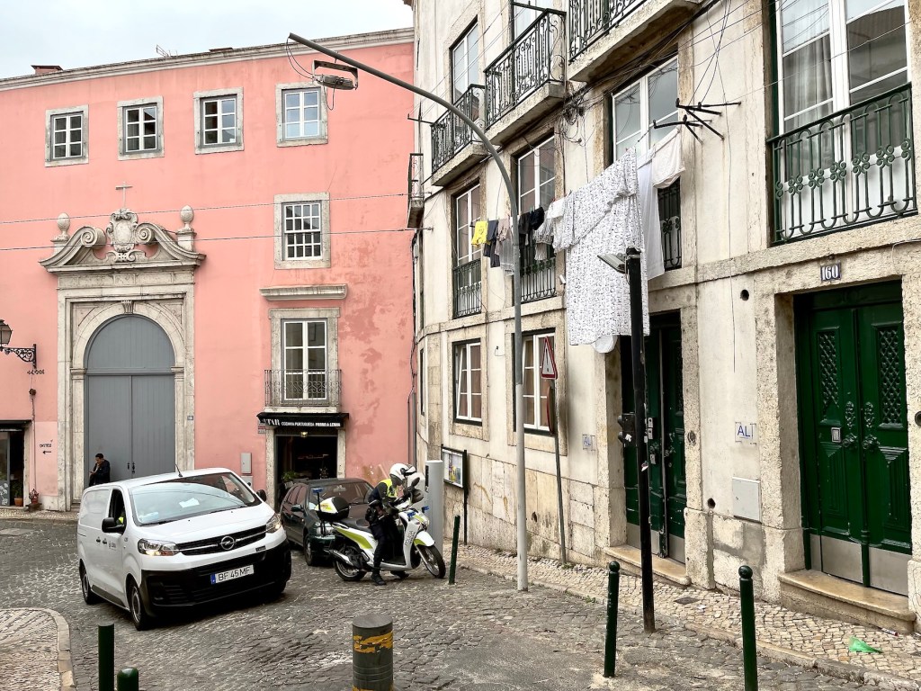 So, let’s see, what I did catch. The first set of pictures below, that’s our street in the freguesia (civil parish) of Santa Maria Maior, in Old Town Lisbon. The parish is named after the Cathedral of Santa Maria Maior de Lisboa.