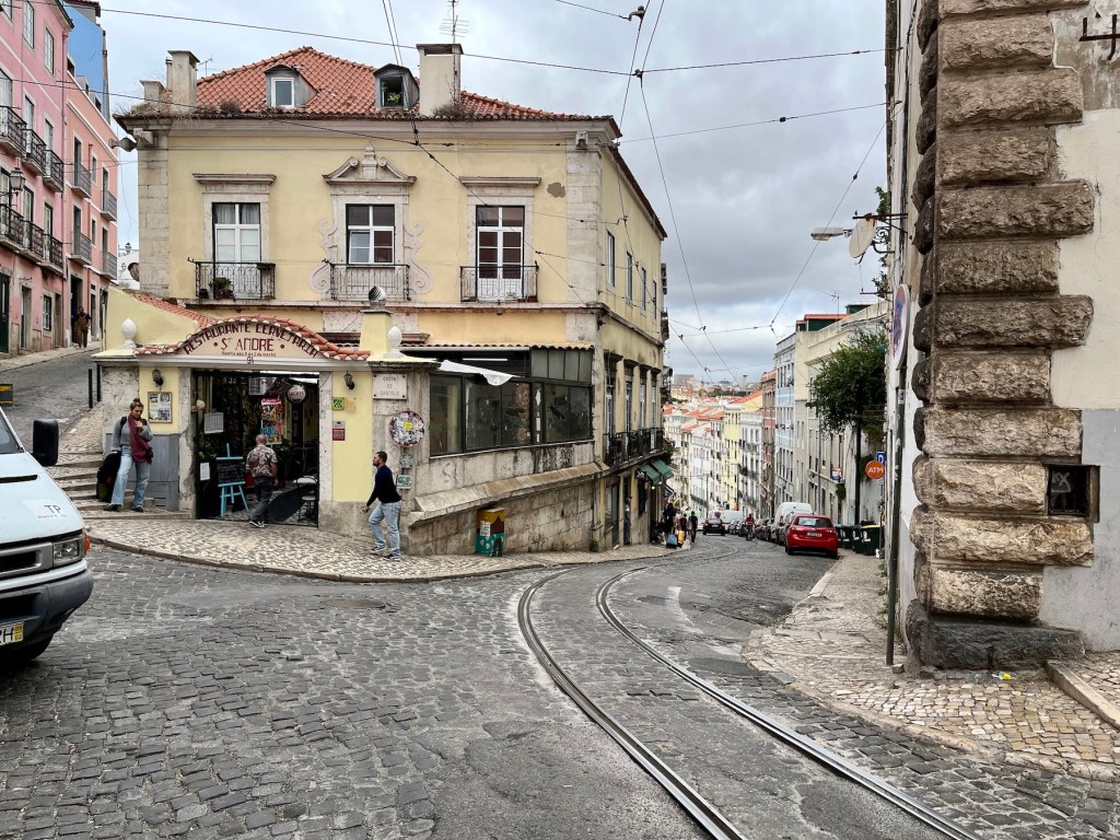 Also, the little house uphill behind the lady in the turquoise top and partially obscured by a streetlight (left pic above), is one of the oldest houses in Lisbon, as Sam told us. It survived wars and earthquakes when others crumbled, and became quite famous for its unusual resilience. My next shot turned out marginally better … just mentally remove the van, please.
