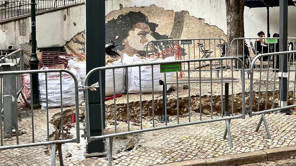 The mosaïc mural of Amália Rodrigues is made of calçada portuguesa pavers, set in a curved retaining wall. It was created by street artist Alexandre Manuel Dias Farto aka Vhils. Rain washing over the image is supposed to evoke the tears which the singer used to shed during her emotional performances.