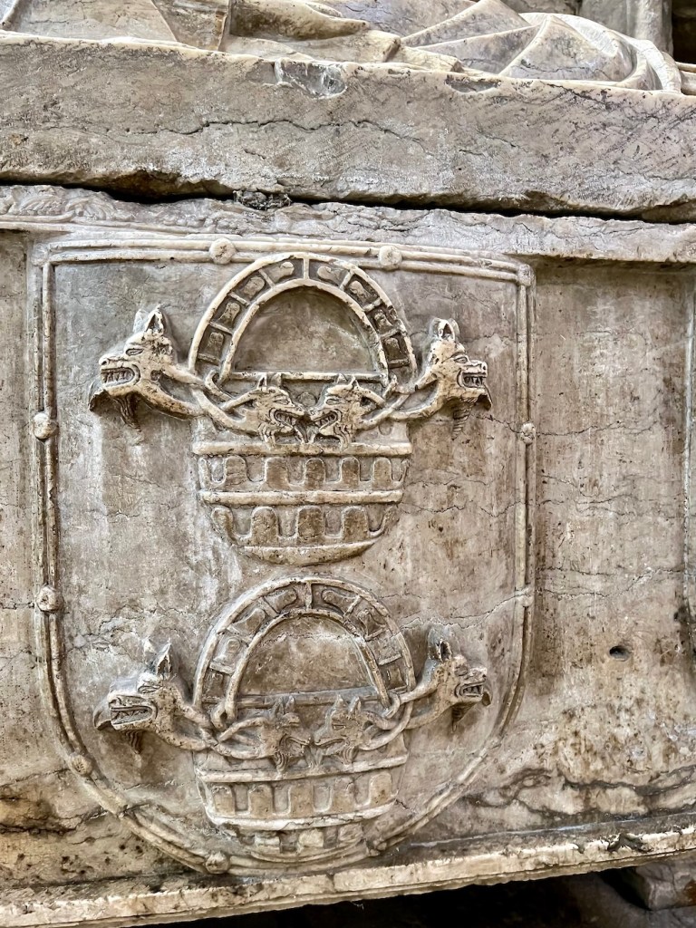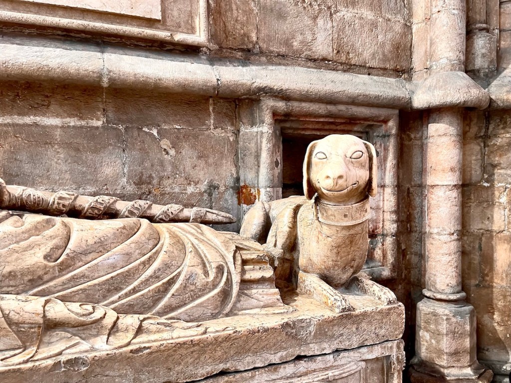 We were circling the main floor of the cathedral at a pretty good clip, when a smiling doggy stopped me in my tracks. The faithful medieval guardian is watching over his master in eternal devotion, forever laying at the feet of Lopo Fernandes Pachero, 1st Lord of Ferreira de Aves (1280 – 1349), himself a faithful and devoted vassal of King Afonso IV, whose sepulcher is displayed in the cathedral as well.