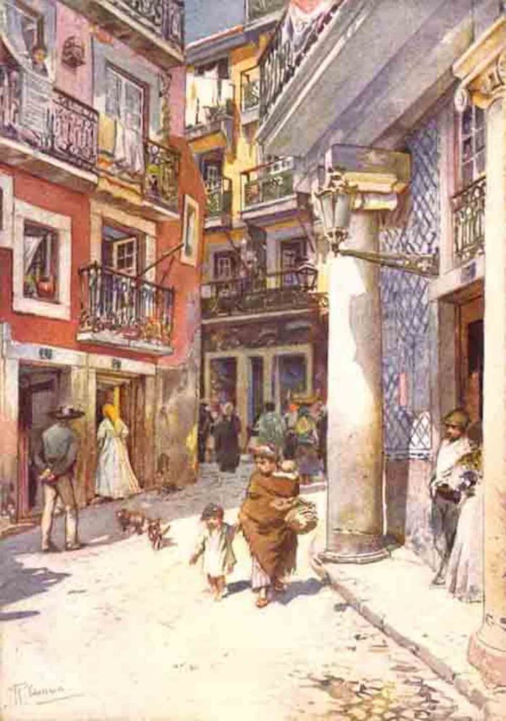 Rua de São Pedro no Largo do Chafariz de Dentro, our table was exactly where the mama with baby and toddler are walking in Roque Gameiro’s watercolor.